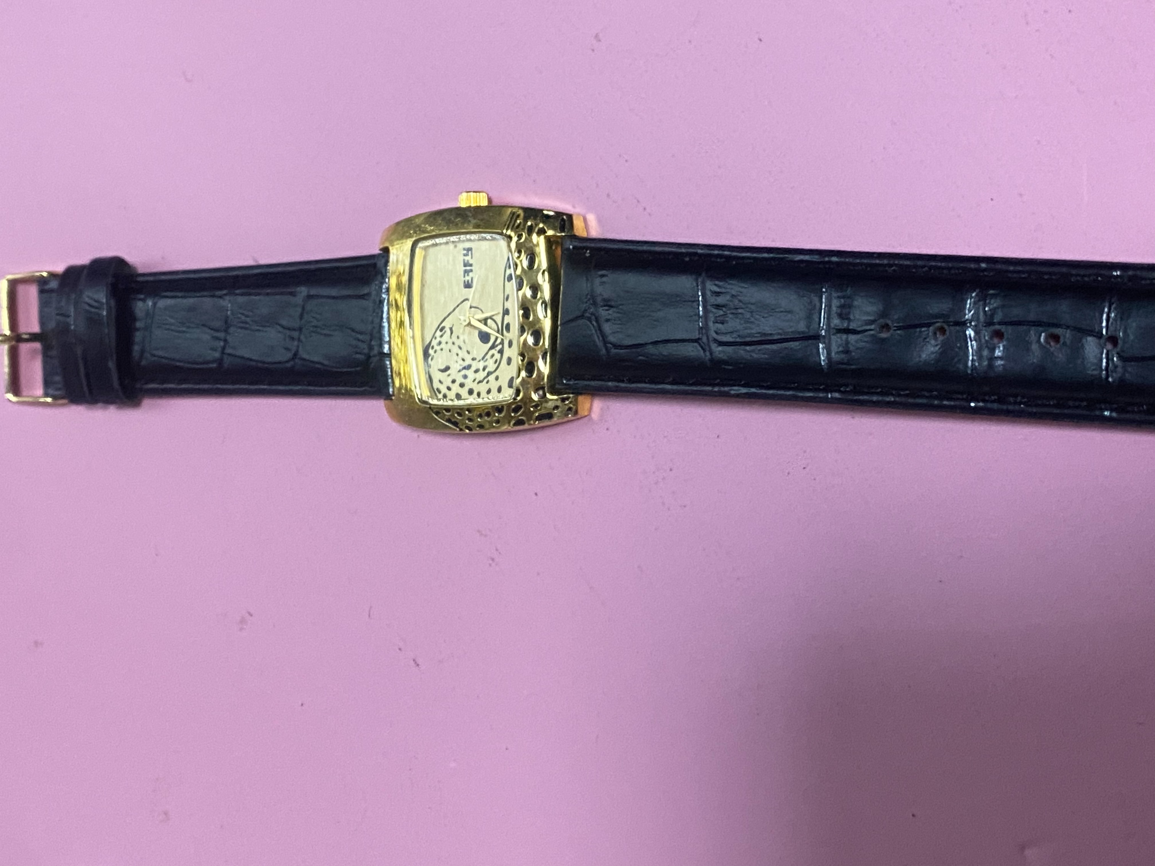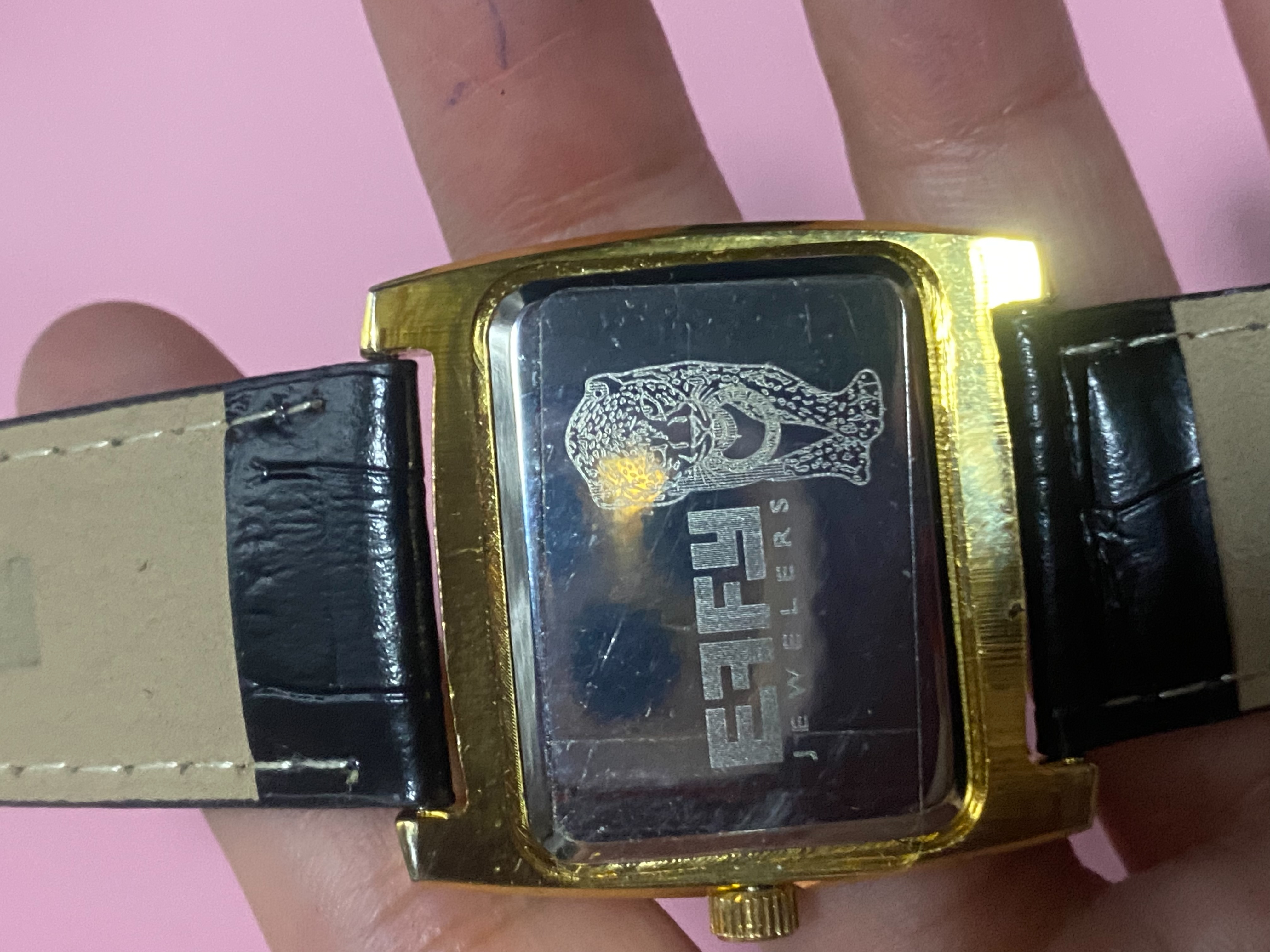 นาฬิกาในภาพคือแบรนด์ EFFY (เอฟฟี่) รุ่นในคอลเลกชัน Signature (Panther) ซึ่งเป็นแบรนด์จิวเวลรี่ชื่อดังจากนิวยอร์กที่โดดเด่นด้วยดีไซน์รูปเสือแพนเธอร์ครับ ข้อมูลสินค้า แบรนด์: EFFY (เอฟฟี่) คอลเลกชัน: Signature / Panther Collection ดีไซน์: หน้าปัด: ดีไซน์รูปเสือแพนเธอร์ (Leopard/Panther) สีทอง พร้อมประดับอัญมณี (มักเป็นมรกตหรือซาฟไฟร์) ที่ดวงตาของเสือ ตัวเรือน: ทรงถังเบียร์ (Tonneau) สีทองหรูหรา สาย: สายหนังจระเข้สีดำ (Black Crocodile Embossed Leather) ระบบ: Quartz (ใช้ถ่าน)