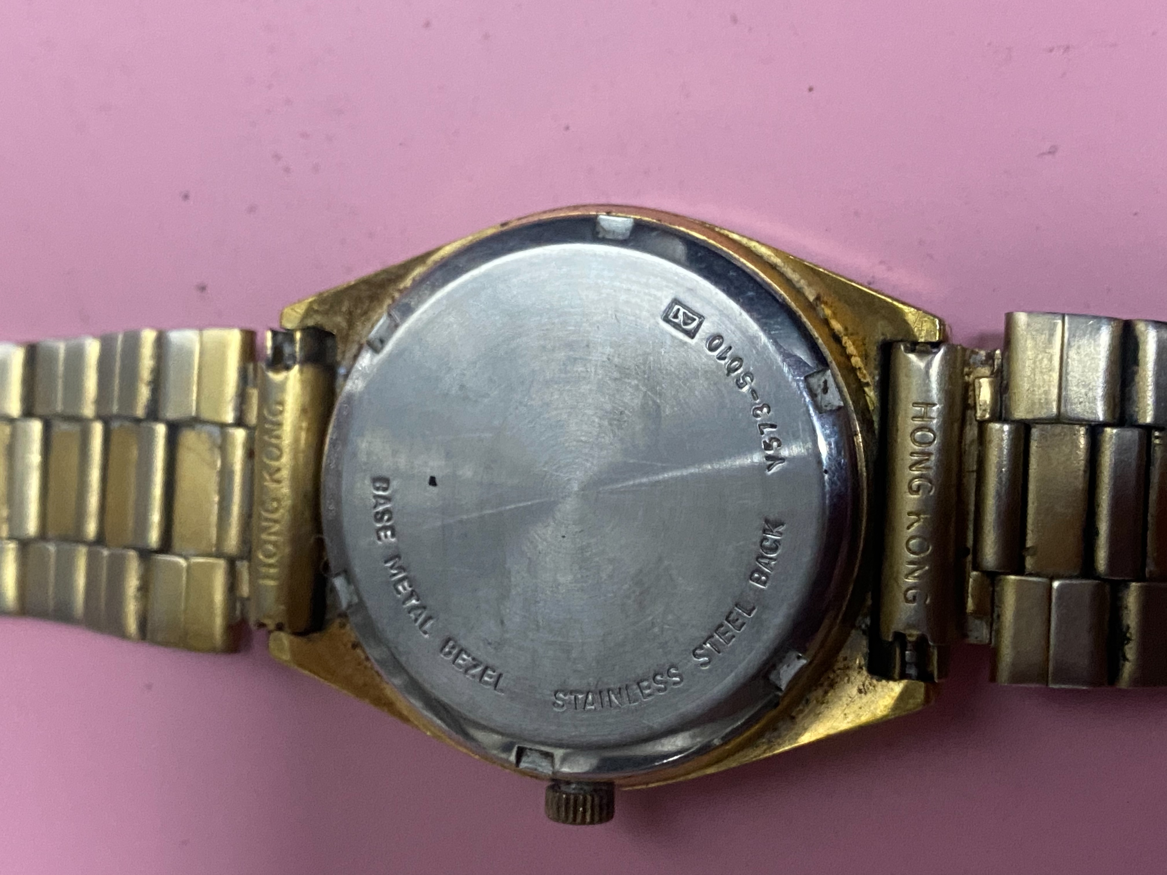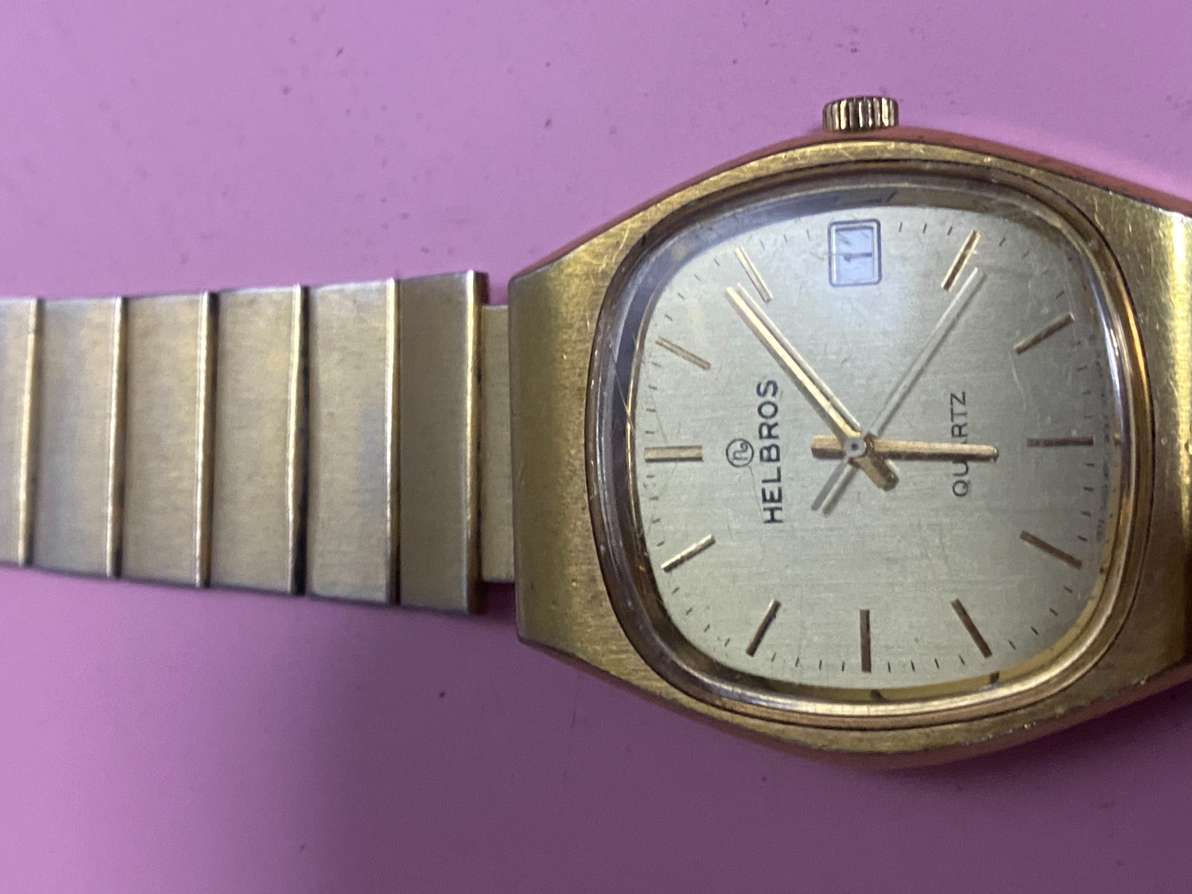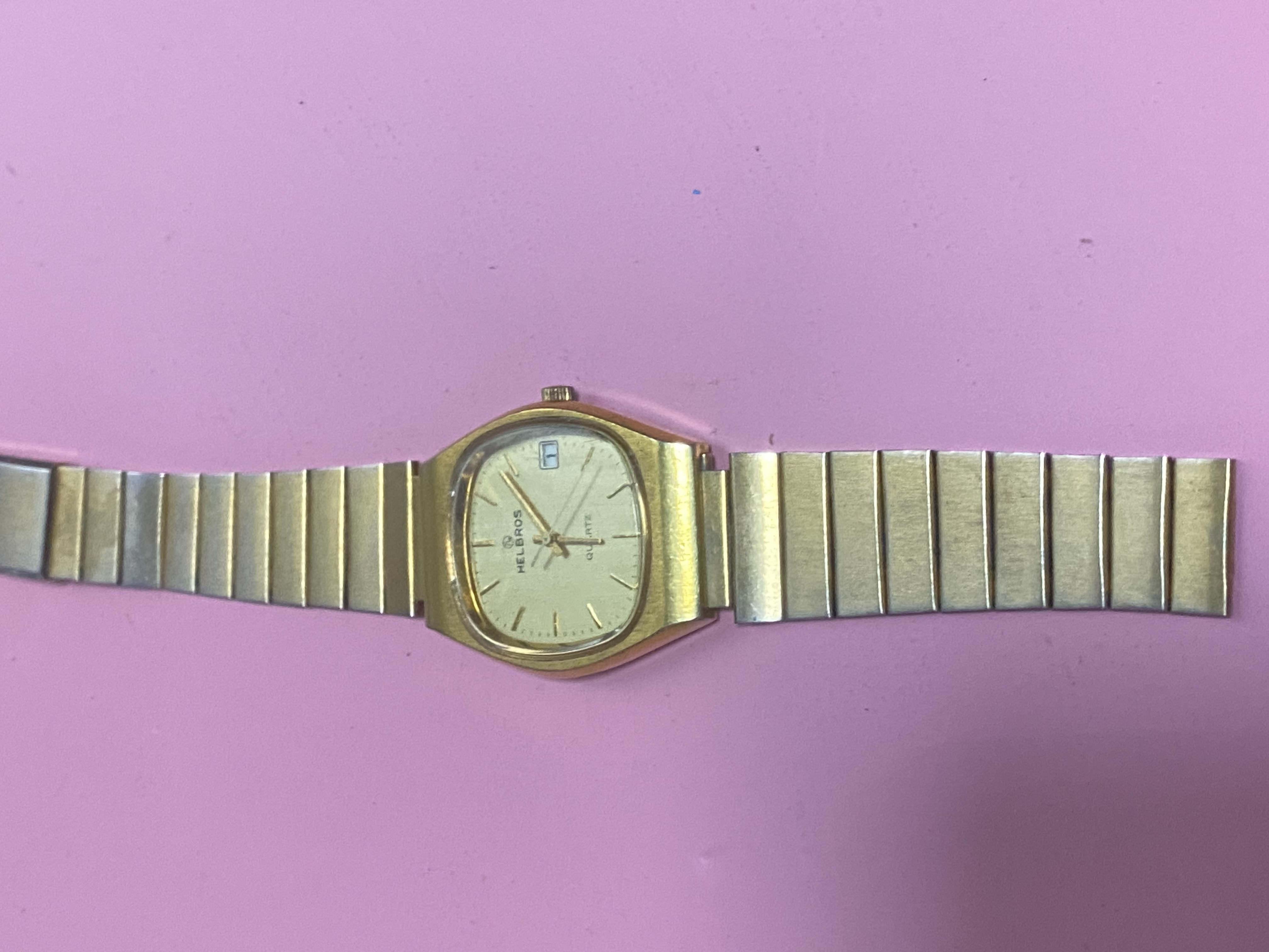นาฬิกาในภาพคือนาฬิกาวินเทจจากแบรนด์ Helbros (เฮลโบรส) ซึ่งเป็นแบรนด์ที่มีชื่อเสียงด้านนาฬิกาคุณภาพดีในราคาเข้าถึงได้ในช่วงกลางศตวรรษที่ 20 ครับ ข้อมูลสินค้า แบรนด์: Helbros (เฮลโบรส) ดีไซน์: ตัวเรือนทรงถังเบียร์ (Tonneau) สีทอง มาพร้อมสายโลหะแบบยืด (Expansion Band) สีเงินสลับทอง (Two-tone) ซึ่งเป็นสไตล์ยอดนิยมในช่วงยุค 1970 - 1980 หน้าปัด: สีทองแชมเปญ มีช่องแสดง วันที่ (Date) ที่ตำแหน่ง 3 นาฬิกา และเข็มวินาทีสีทองเข้าชุดกัน ระบบการทำงาน: Quartz (ใช้ถ่าน) สังเกตจากข้อความบนหน้าปัดที่ระบุว่า "QUARTZ" ซึ่งให้ความแม่นยำสูง