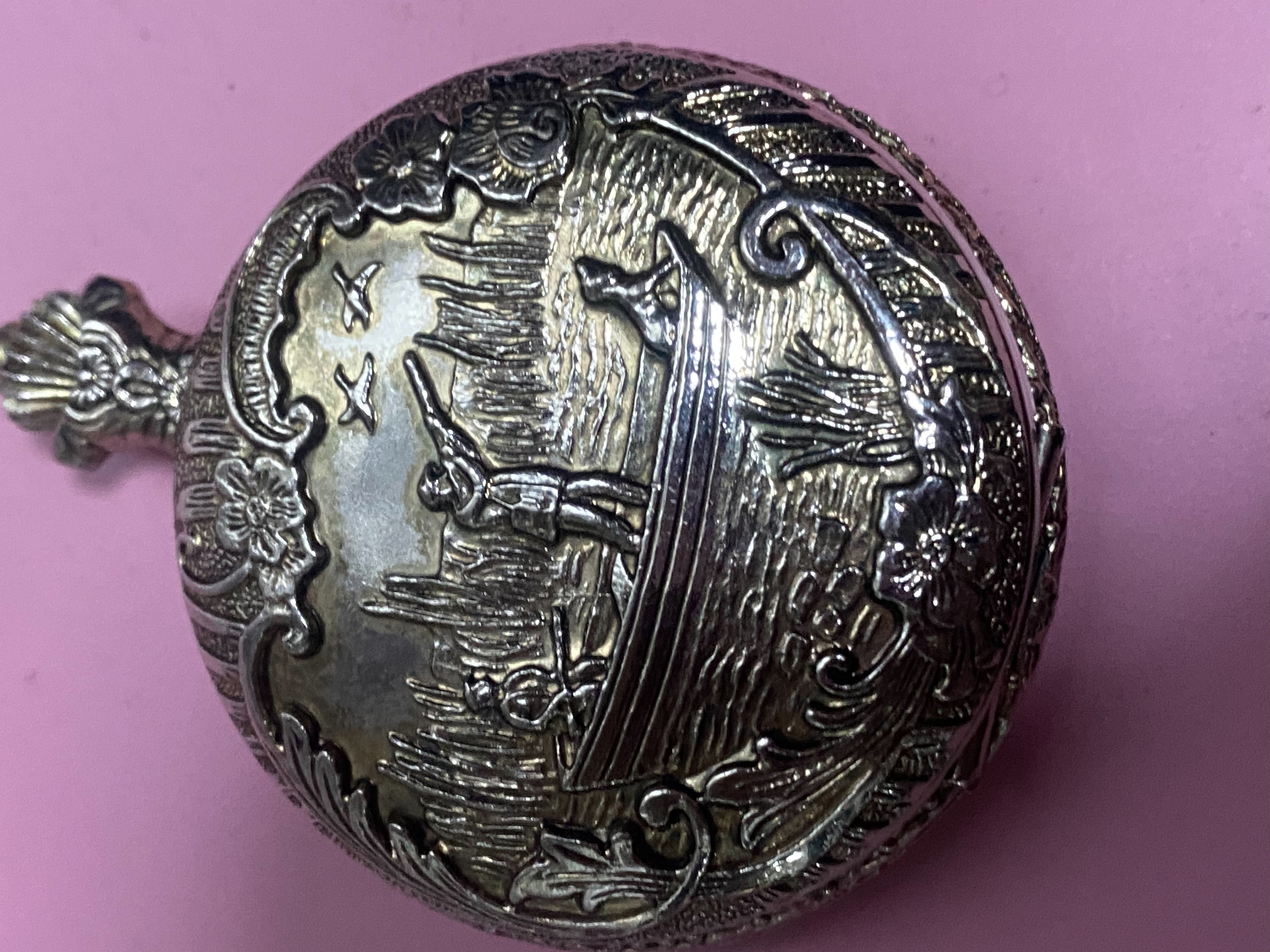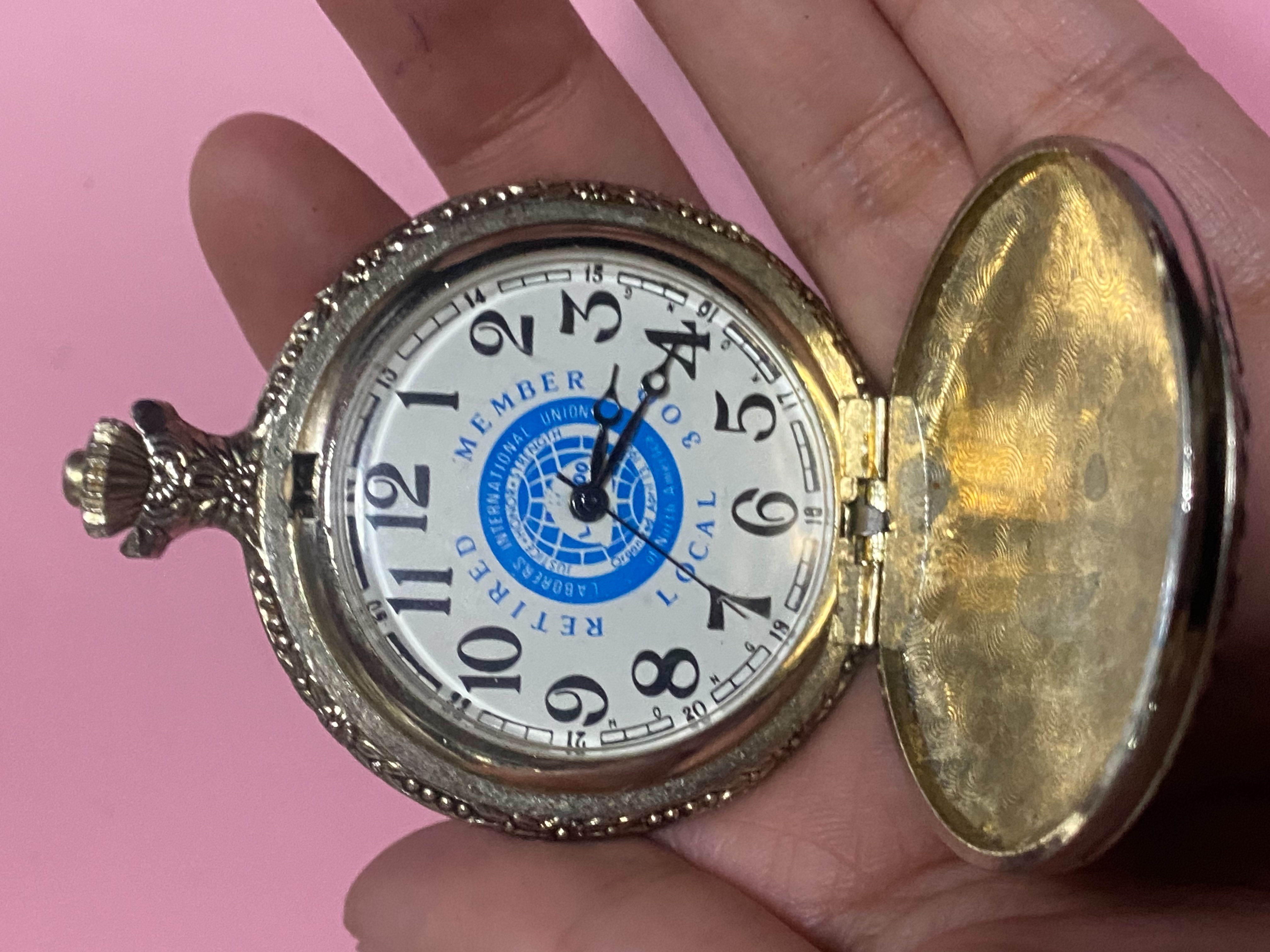 นาฬิกาพกในภาพของคุณคือ นาฬิกาพกที่ระลึกสำหรับสมาชิกที่เกษียณอายุ (Retired Member) ของสหภาพแรงงาน LIUNA (Laborers' International Union of North America) โดยเฉพาะสำหรับ Local 300 ข้อมูลเบื้องต้นและรายละเอียด แบรนด์/ผู้ผลิต: นาฬิกาลักษณะนี้มักถูกสั่งทำพิเศษจากบริษัทอย่าง Arnex หรือ The American Time Companies ซึ่งเป็นบริษัทที่มีความเชี่ยวชาญในการผลิตนาฬิกาพกที่ระลึกและนาฬิกาพิมพ์ลายพิเศษ (UV printed) ดีไซน์: หน้าปัด: พื้นสีขาว พิมพ์สัญลักษณ์วงกลมสีน้ำเงินของสหภาพแรงงาน LIUNA ตรงกลาง พร้อมข้อความ "RETIRED MEMBER" และ "LOCAL 300" ตัวเรือน: เป็นโลหะชุบทอง (Gold-tone) มักมีการแกะสลักลวดลายประณีตที่ขอบและด้านหลัง เช่น ลายฉากล่าสัตว์ (Hunting Scene) หรือลายพรรณไม้ ระบบการทำงาน: ส่วนใหญ่ใช้กลไก Quartz (ใช้ถ่าน) จากญี่ปุ่นหรือสวิตเซอร์แลนด์ ซึ่งขึ้นชื่อเรื่องความเที่ยงตรง ประวัติ: นาฬิกาประเภทนี้มักมอบให้เป็นของขวัญเกียรติยศเพื่อรำลึกถึงการทำงานและความเสียสละของสมาชิกสหภาพแรงงานเมื่อถึงคราวเกษียณอายุ