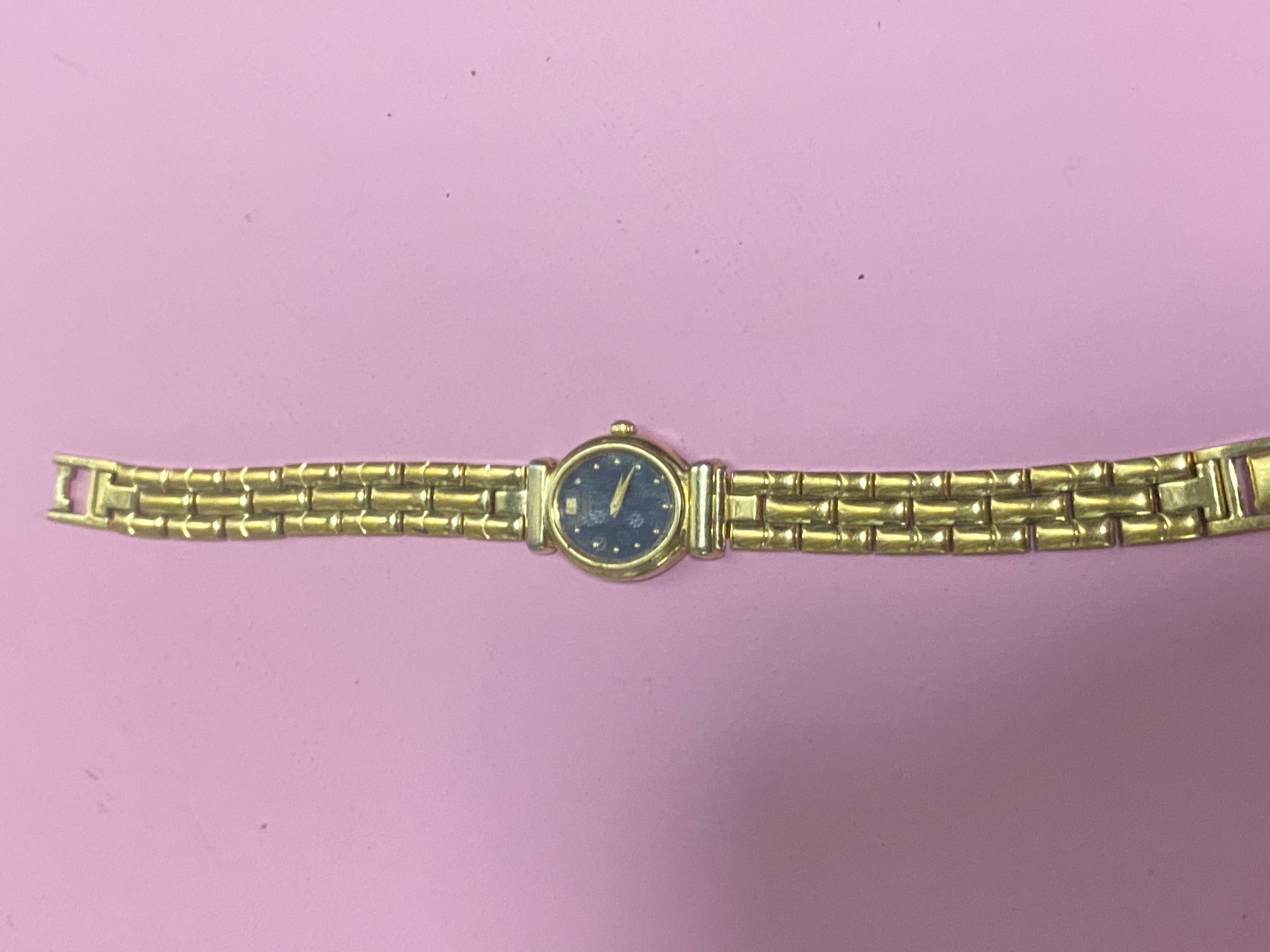 นาฬิกาในภาพคือ Seiko Quartz สำหรับสุภาพสตรี รุ่นวินเทจจากช่วงปี 1980-1990 ซึ่งเป็นนาฬิกาสไตล์เครื่องประดับ (Jewelry Watch) ที่ได้รับความนิยมสูงในสมัยนั้นครับ [1, 3] ข้อมูลสินค้า แบรนด์: Seiko (ไซโก้) ผลิตในประเทศญี่ปุ่น [3, 5] ดีไซน์: ตัวเรือน: ทรงกลมขนาดเล็ก (Tiny Round Case) สีทองหรูหรา [1, 7] หน้าปัด: สีน้ำเงินเข้ม (Deep Blue) ประดับด้วยจุดบอกเวลาสีทอง (Gold dots) และเข็มบอกเวลาสีทอง 2 เข็ม [1, 3] สาย: สายโลหะดีไซน์แบบข้อต่อทรงกระบอก (Bamboo-style หรือ Panther link) สีทอง ซึ่งออกแบบมาให้สวมใส่แล้วดูเหมือนกำไลข้อมือ [1, 3, 5] ระบบการทำงาน: Quartz (ระบบถ่าน) ที่เน้นความเที่ยงตรงและดูแลรักษาง่าย [3, 5] รหัสรุ่นที่ใกล้เคียง: มักอยู่ในซีรีส์เครื่องรหัส 1221-5570 หรือ 5421-5250 ซึ่งเป็นรุ่นยอดนิยมในกลุ่มนาฬิกาวินเทจสุภาพสตรีของไซโก้