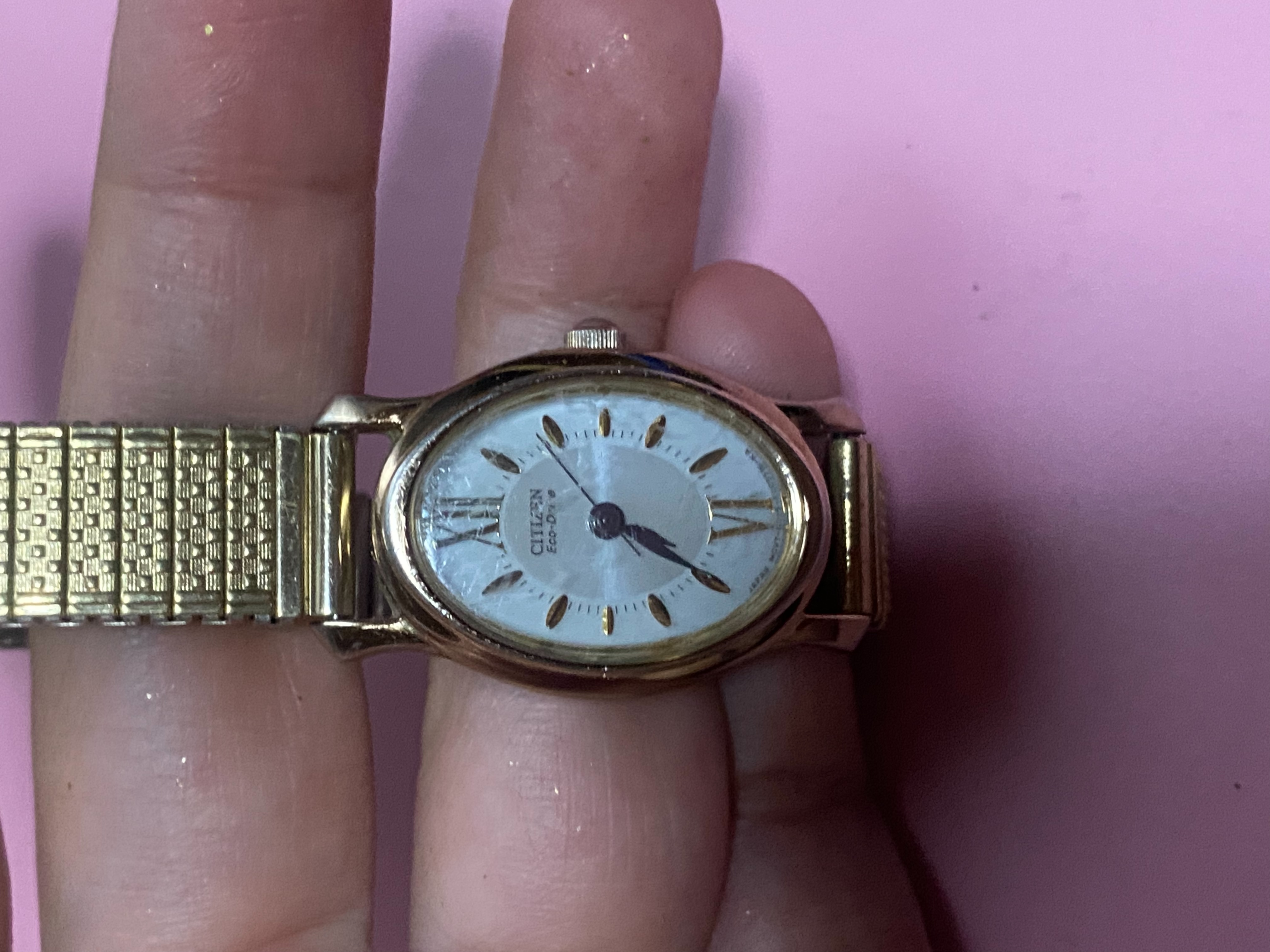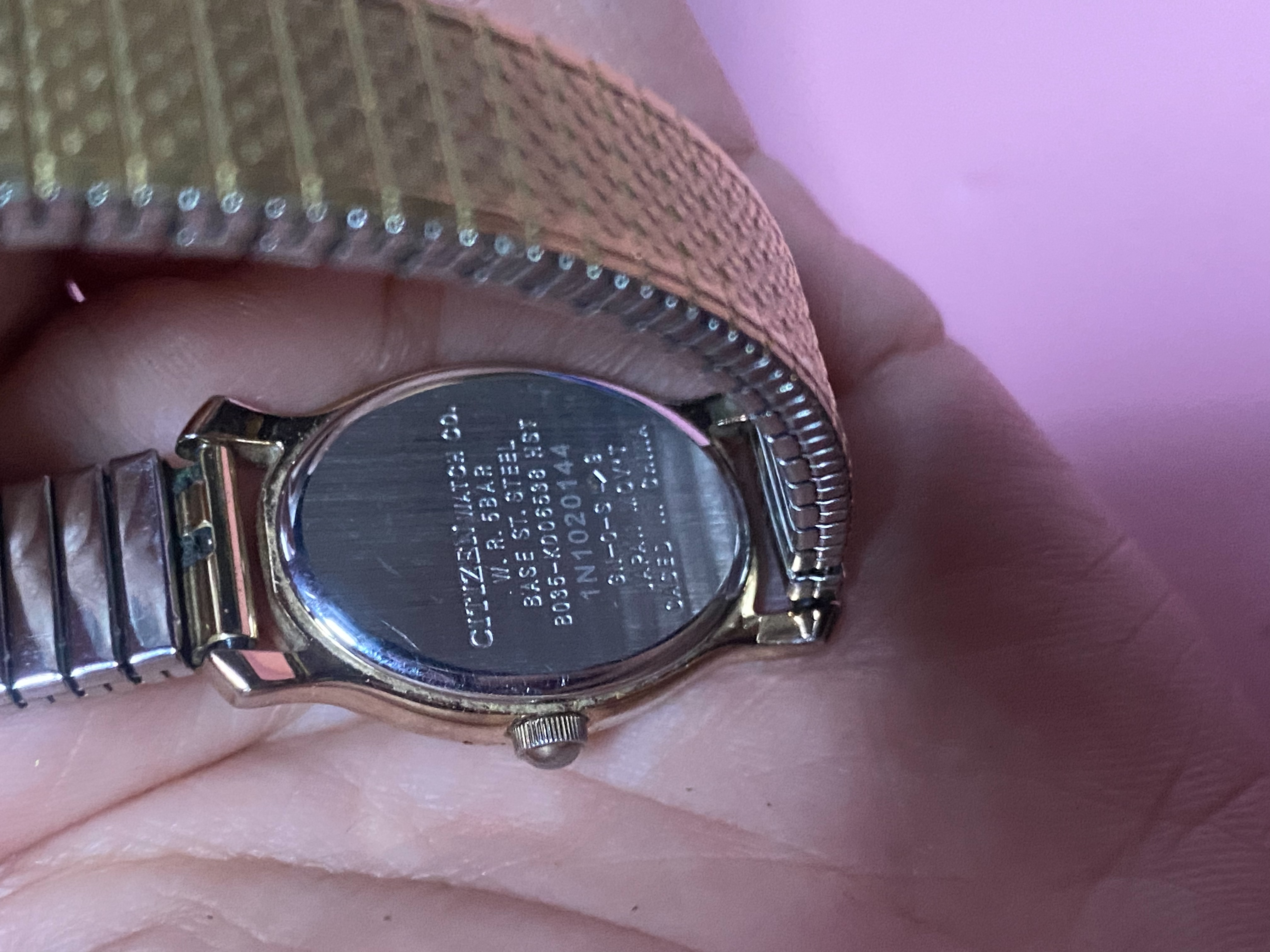 จากการตรวจสอบรูปภาพ นาฬิกาเรือนนี้คือแบรนด์ Citizen (ซิติเซ็น) รุ่น Eco-Drive สำหรับผู้หญิง ซึ่งมีความโดดเด่นด้วยหน้าปัดรูปทรงไข่ (Oval) และใช้เทคโนโลยีพลังงานแสง ข้อมูลรายละเอียดและวัสดุ แบรนด์: Citizen รุ่น Eco-Drive ซึ่งเป็นระบบที่ชาร์จพลังงานจากแสงทุกชนิด ไม่ต้องเปลี่ยนถ่านบ่อย หน้าปัด: เป็นหน้าปัดมุก (Mother of Pearl) ซึ่งให้ความเงางามหลากสีเมื่อสะท้อนแสง วัสดุ (ทองคำแท้หรือทองชุบ?): โดยทั่วไปนาฬิกา Citizen รุ่นลักษณะนี้จะทำจาก สแตนเลสสตีลชุบทอง (Gold Plated Stainless Steel) ไม่ใช่ทองคำแท้ทั้งเรือน สังเกตได้จากฝาหลังที่มักจะระบุว่าเป็น Stainless Steel สาย: เป็นสายแบบยืดได้ (Expansion Band) สีทอง ซึ่งเป็นดีไซน์วินเทจที่สวมใส่สบาย