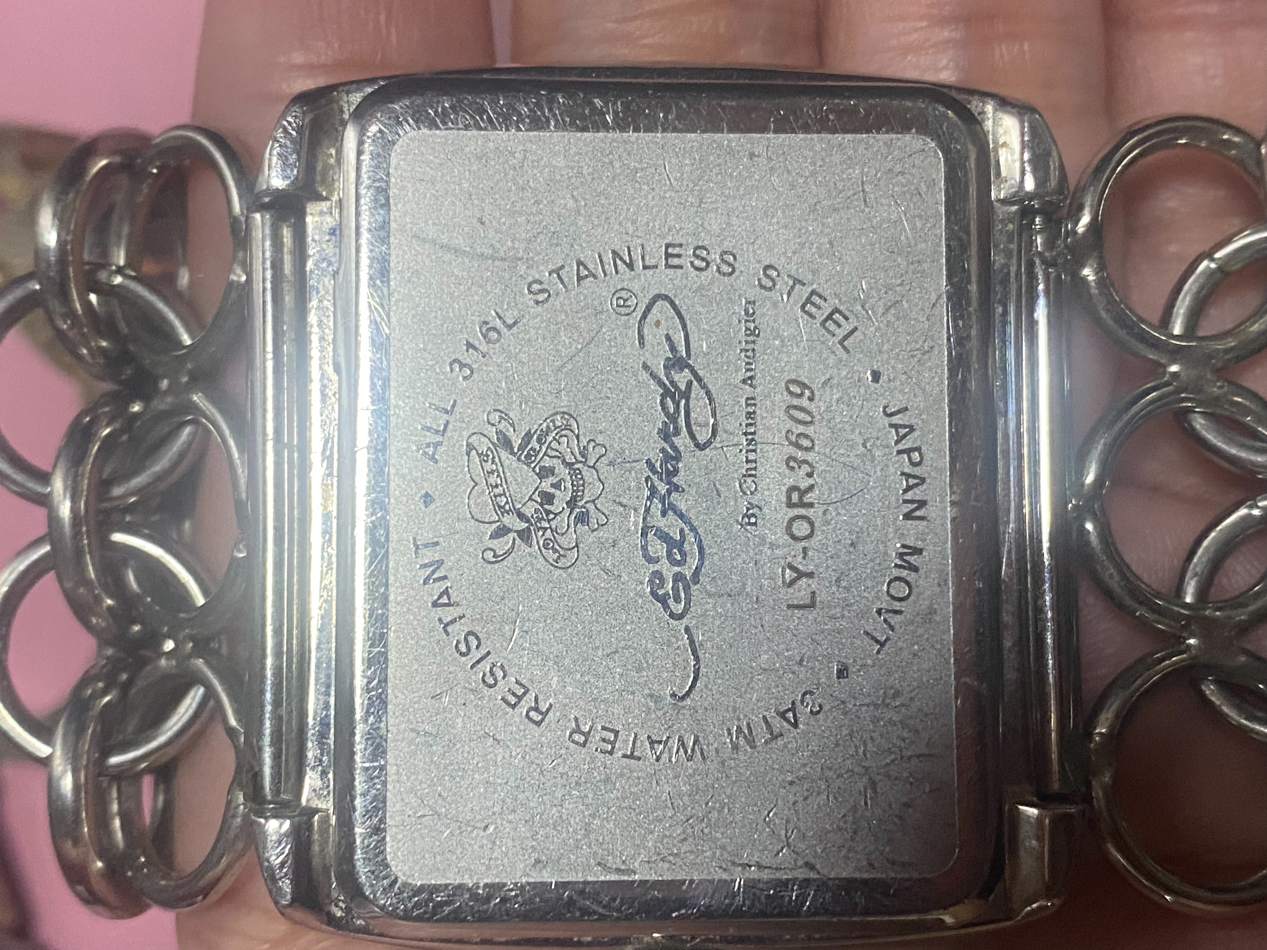 นาฬิกาในรูปภาพของคุณคือ Ed Hardy รุ่น Lynx Orchid (รหัสรุ่น: LY-OR) ซึ่งเป็นนาฬิกาแฟชั่นที่มีเอกลักษณ์เฉพาะตัวจากแบรนด์ Ed Hardy โดยดีไซเนอร์ชื่อดัง Christian Audigier ครับ ข้อมูลรายละเอียดและราคาประเมิน แบรนด์: Ed Hardy ของแท้ โดยสังเกตได้จากโลโก้และงานศิลปะลายสัก (Tattoo Art) ที่เป็นเอกลักษณ์บนหน้าปัด ดีไซน์: รุ่นนี้โดดเด่นด้วยหน้าปัดทรงสี่เหลี่ยมผืนผ้า ลายดอกกล้วยไม้ (Orchid) พร้อมสายเหล็กแบบห่วงวงกลม 3 แถว (Triple Link Band) ระบบการทำงาน: ระบบควอตซ์ (Quartz) จากญี่ปุ่น (Japanese Movement) และคุณสมบัติกันน้ำระดับ 30 เมตร (3 ATM)