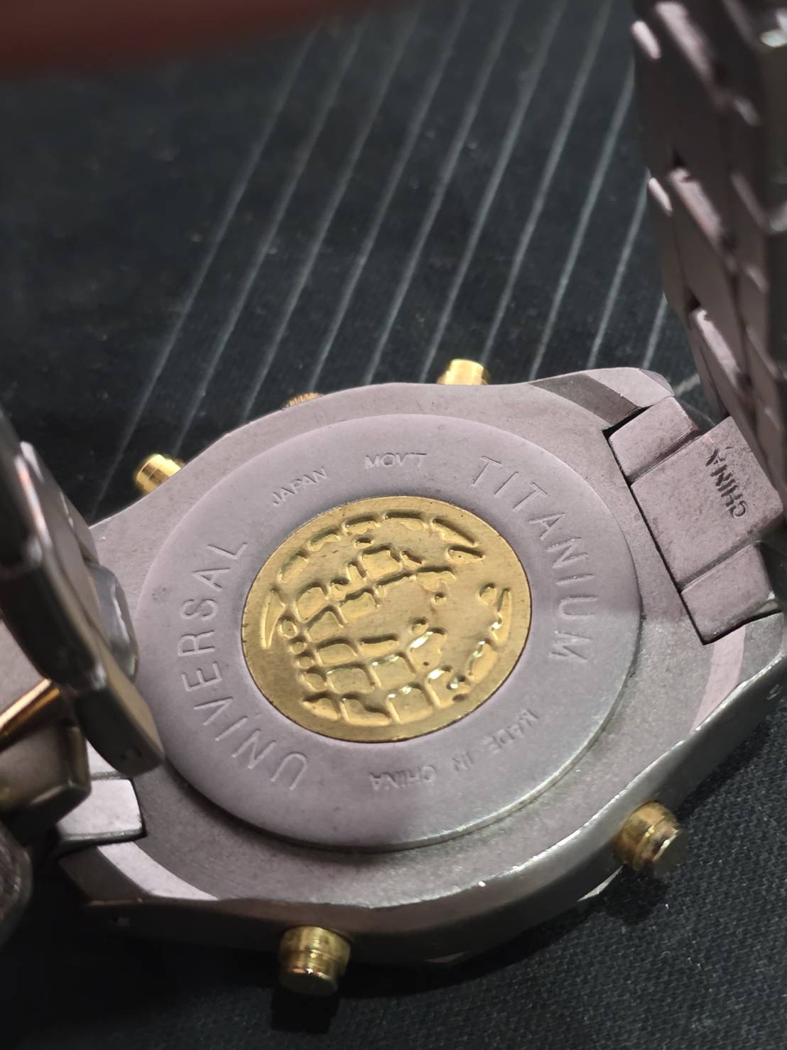 นาฬิกาในภาพคือ Universal Titanium เป็นนาฬิกาสไตล์ Chronograph ที่เน้นดีไซน์แนวสปอร์ตวินเทจครับ ข้อมูลรายละเอียดของนาฬิกา แบรนด์ (Brand): Universal Titanium (หรือบางแหล่งระบุเป็นแบรนด์ Geneva ในรุ่น Titanium) ปีผลิต (Production Year): เป็นนาฬิกาแนววินเทจที่ได้รับความนิยมในช่วงปลายยุค 1990 ถึงต้นปี 2000 วัสดุผลิต (Materials): ตัวเรือนและสาย: ทำจาก ไทเทเนียม (Titanium) ผสมกับโลหะสเตนเลสในบางส่วน มีความโดดเด่นที่น้ำหนักเบาและมีความทนทานสูง สี: ดีไซน์แบบทูโทน (Two-tone) สีเงินและสีทอง ระบบการทำงาน: ระบบ ควอตซ์ (Quartz) ใช้พลังงานจากถ่าน และใช้เครื่องจากญี่ปุ่น (Japan Movt)