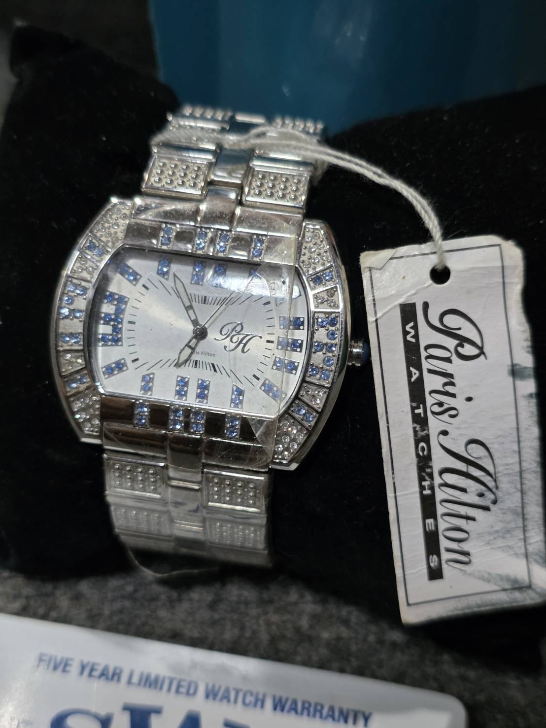 นาฬิกาในรูปของคุณคือนาฬิกาแบรนด์ Paris Hilton (ปารีส ฮิลตัน) รุ่น PH1165 ซึ่งเป็นนาฬิกาแฟชั่นระดับพรีเมียมจากคอลเลกชันช่วงปี 2000 ที่เน้นความหรูหราและ "Bling" ตามสไตล์ของคุณปารีส ฮิลตันครับ ข้อมูลรายละเอียดของนาฬิกา: แบรนด์: Paris Hilton Watches โดยมี The SWI Group (Swiss Watch International) เป็นผู้ถือลิขสิทธิ์ในการผลิตและจัดจำหน่ายในช่วงนั้น ปีผลิต: รุ่นนี้อยู่ในคอลเลกชันช่วงปี 2005 - 2008 ซึ่งเป็นยุคที่แบรนด์ได้รับความนิยมสูงสุด วัสดุ: ตัวเรือนและสาย: สแตนเลสสตีล (Stainless Steel) ขัดเงาคุณภาพดี การตกแต่ง: ประดับด้วยคริสตัลสวารอฟสกี้ (Swarovski Crystals) ทั้งบนหน้าปัดและขอบตัวเรือน หน้าปัด: พื้นสีขาวนวล พร้อมโลโก้ "PH" ที่ตำแหน่ง 12 นาฬิกา ระบบเครื่อง: ใช้เครื่องระบบ Quartz คุณภาพมาตรฐาน